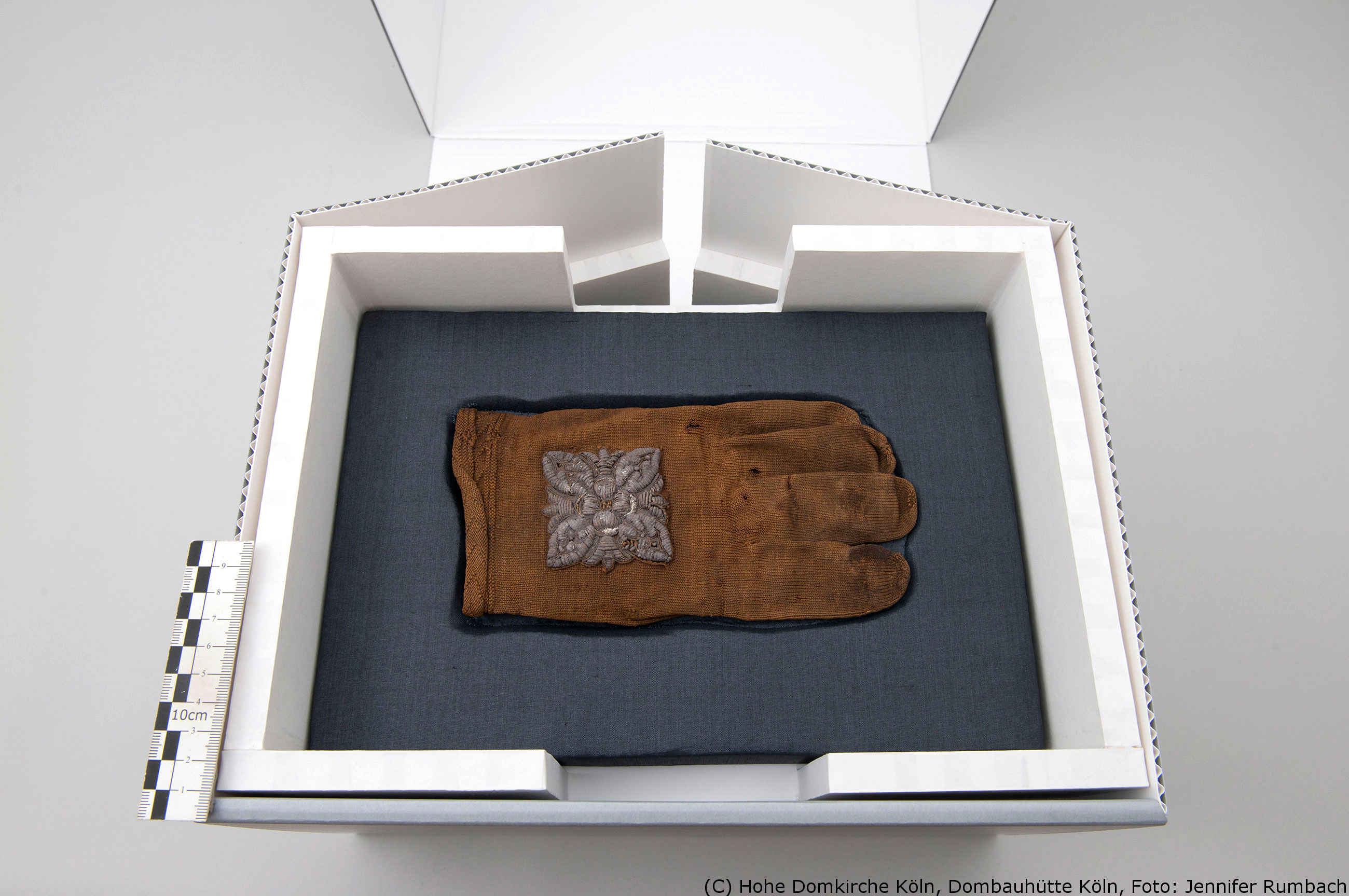 • Covering the care of a textile around climate, light and storage Suitable packaging - carpetsCleaned archaeological find in panel for storage and presentation. Cologne, Cologne Cathedral, Cathedral excavation, pontifical glove, back of the hand, left Hand, final condition